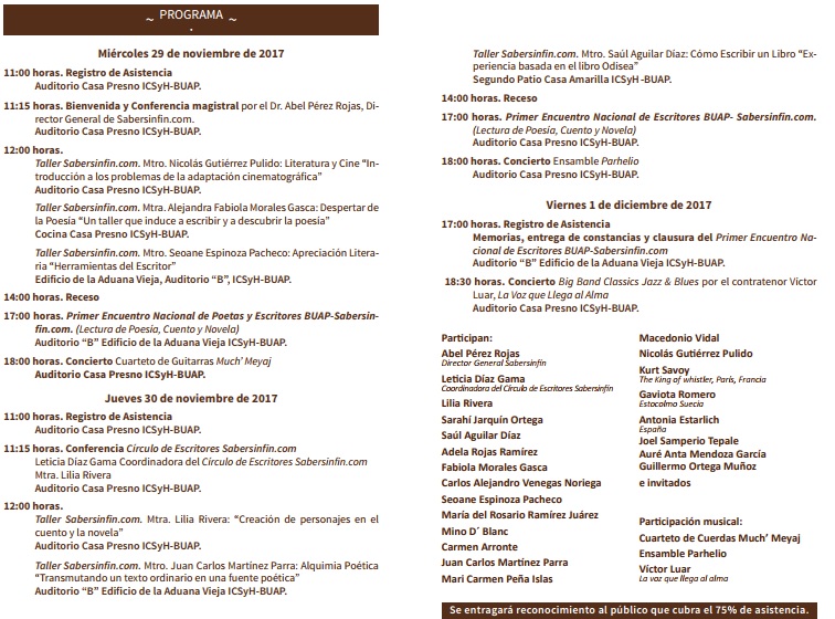 Puebla,Puebla,Noviembre 2017.-En el marco del Primer Encuentro Nacional de Escritores BUAP – Sabersinfin, los días 29 y 30 de noviembre, y el 1 de diciembre, escritores originarios de México, Estados Unidos, España y Nicaragua compartirán su saber y su obra con los poblanos.