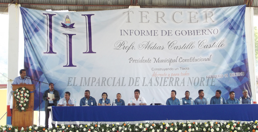 Tlaola, Puebla.Febrero 2017.-Los ciudadanos del municipio se dieron cita este 11 de febrero del 2017, para escuchar el Tercer Informe de gobierno del presidente Abdias Castillo Castillo que dio a conocer cada una de las obras, proyectos y trabajo que se llevó a cabo en el municipio, “y donde poco a poco los compromisos se van cumpliendo”